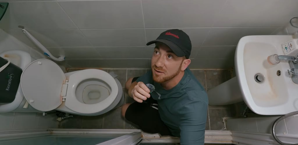 Дрю Бински е приклекнала в една госиуон баня. Снимка: YouTube/Дрю Бински Binsky също черпи от собствения си опит, живеещ в компактни жилища в Южна Корея докато работи като учител по английски език през 2013 г. Той си спомня, че е бил поразен от дизайна на банята, който обединява мивката и душа в едно тяло – спестяващо място устройство, което понякога го оставяше мокър, след като случайно включи душа вместо крана на мивката.