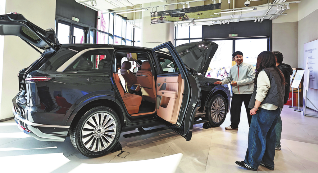 Клиенти пазаруват за ново енергийно превозно средство в автокъща в област Nanhu, Jiaxing, провинция Zhejiang, на 21 февруари. Поредица от кампании за промоция на потреблението „Обновяване на пролетния фестивал“, стартирани от големи магазини за домакински уреди и автокъщи в Jiaxing, привлякоха голям брой потребители. JIN PENG/ЗА КИТАЙ ДЕЙЛИ