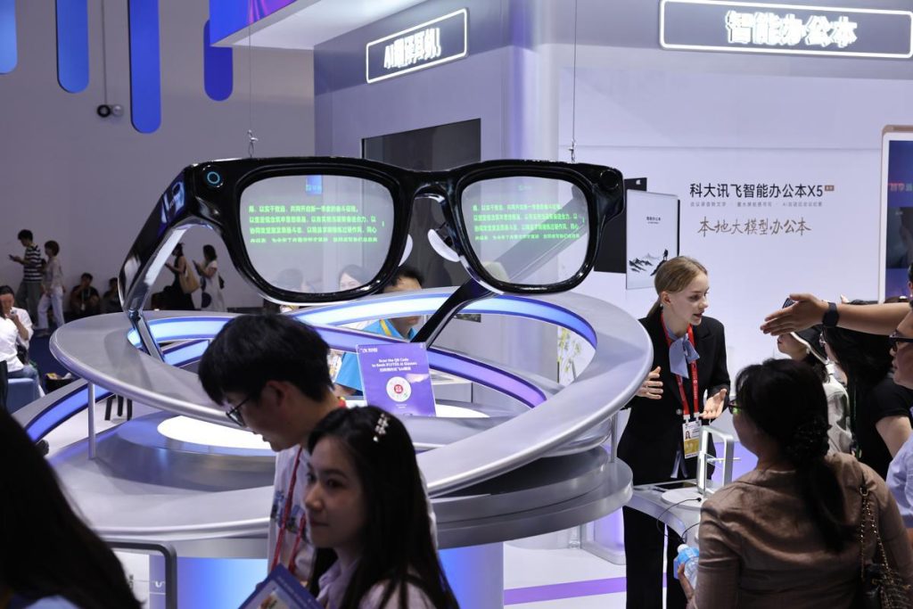 Посетителите проверяват очилата с изкуствен интелект от китайската компания за изкуствен интелект iFLYTEK на Китайското международно изложение за потребителски продукти в Хайкоу, провинция Хайнан, в понеделник. WANG JING / КИТАЙ ДАЙЛИ