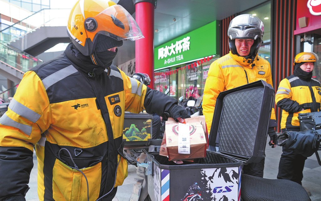 Доставчици взимат хранителни пакети от ресторант в Zouping, провинция Шандонг. Dong Naide/За Китай Daily