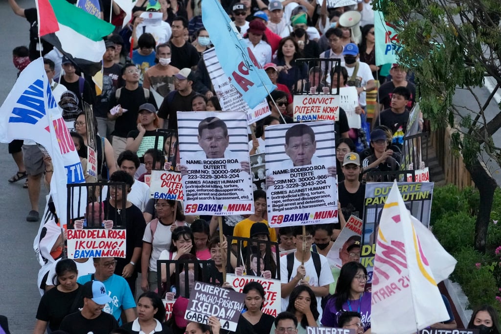 Протестиращите държат снимки на бившия президент Родриго Дутерте, докато призовават за справедливост за жертвите на войната срещу наркотиците по време на неговото управление в Кесон Сити, Филипините, през март 2025 г. Снимка: APПротестиращите държат снимки на бившия президент Родриго Дутерте, докато призовават за справедливост за жертвите на войната срещу наркотиците по време на неговото управление в Кесон Сити, Филипините, през март 2025 г. Снимка: AP