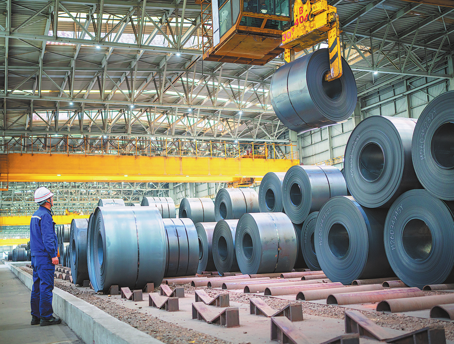 Служител изпраща горещо валцувани стоманени рулони в цех за горещо валцуване в Ma’anshan, провинция Anhui, на 28 февруари. ZHANG MINGWEI/ЗА КИТАЙ ДАЙЛИ