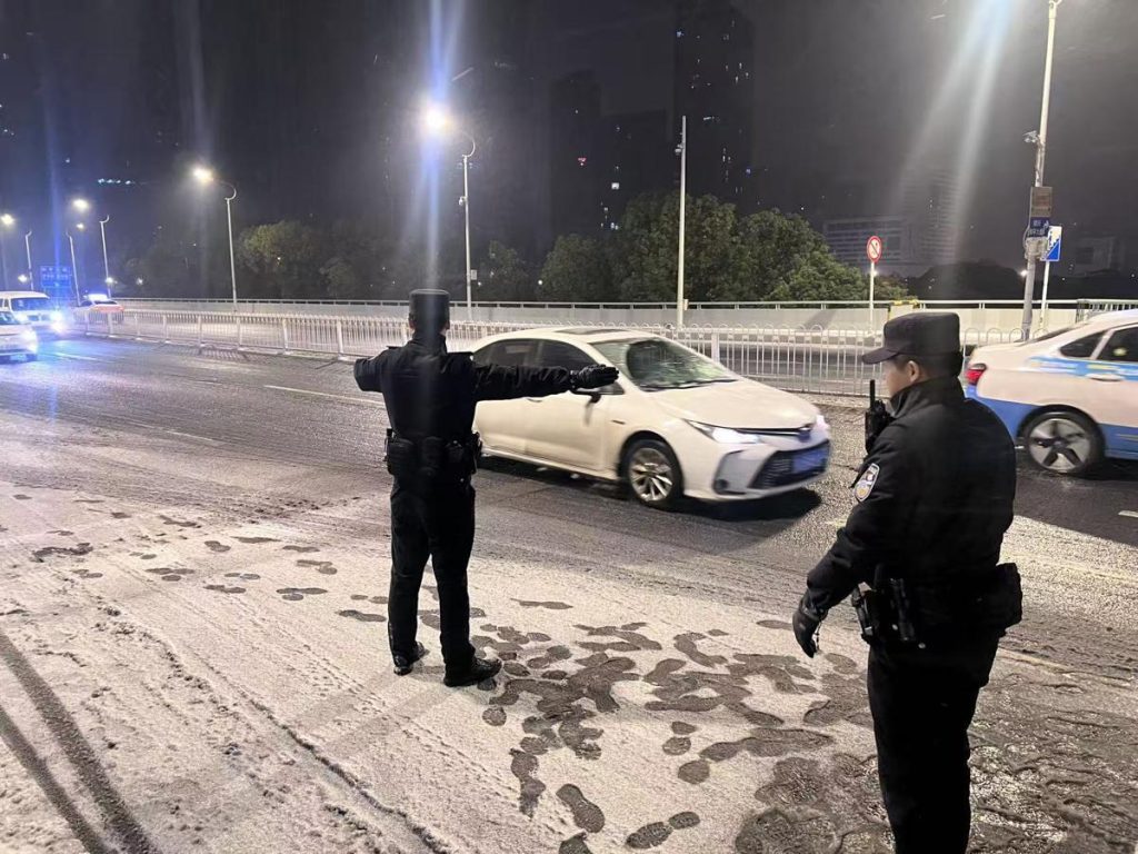 Полицейски автомобили патрулират по виадукти и кръстовища, за да помогнат на трафика да се адаптира към мокри и заледени пътища. Полицаите осигуряват и снегопочистване и оказват спешна помощ на подхлъзналите се и паднали пешеходци.