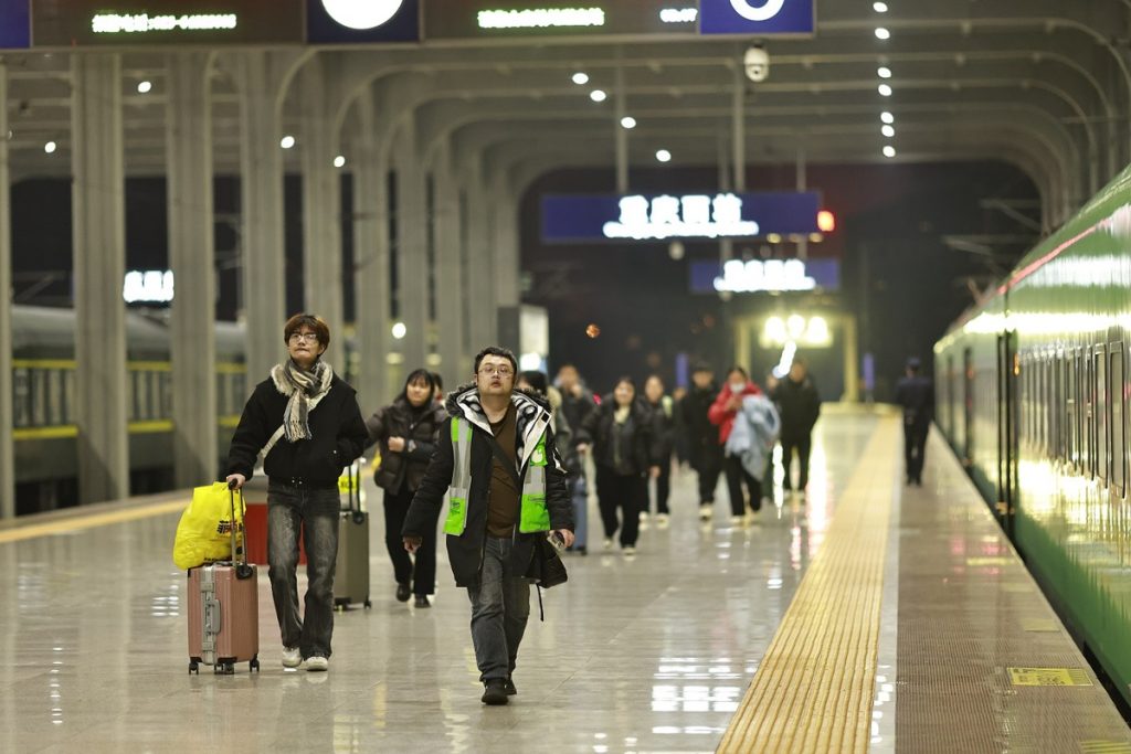 Пътниците пристигат на западната жп гара Chongqing с късен нощен влак от източната жп гара Bazhong на 10 февруари 2026 г. [Photo by Su Zhigang/For chinadaily.com.cn]