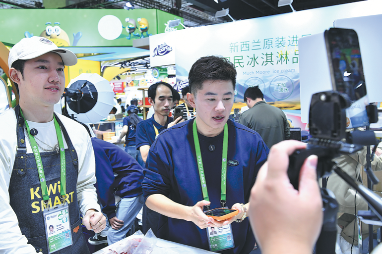 Домакините на Shanghai Onair Studio рекламират млечни продукти от Нова Зеландия чрез предаване на живо по време на Китайското международно изложение за внос в Шанхай по-рано този месец. КИТАЙ ДЕЙЛИ