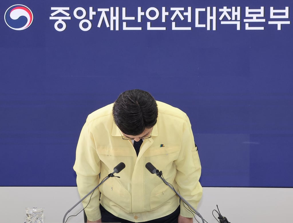Министърът на вътрешните работи и безопасността Юн Хо-джунг се покланя в извинение по време на централна среща за борба с бедствия в бедствия и безопасност в понеделник. Снимка: EPA/Yonhap